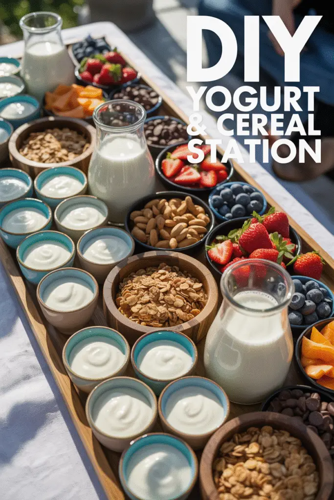How to Make It: Set up small cups of yogurt or cereal with separate bowls of toppings like granola, nuts, chocolate chips, and fresh fruit. Include spoons, tongs, and small pitchers of milk or flavored syrups. Arrange toppings in small glass jars or ramekins for easy access and a clean look.