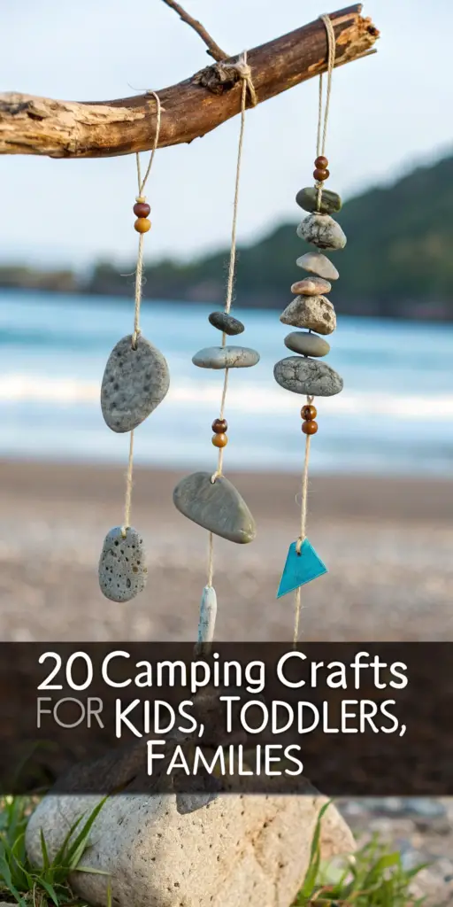 Rock wind chimes create gentle sounds while reusing natural materials. And here’s why that matters: kids learn about sound and rhythm while adding decoration to the campsite.