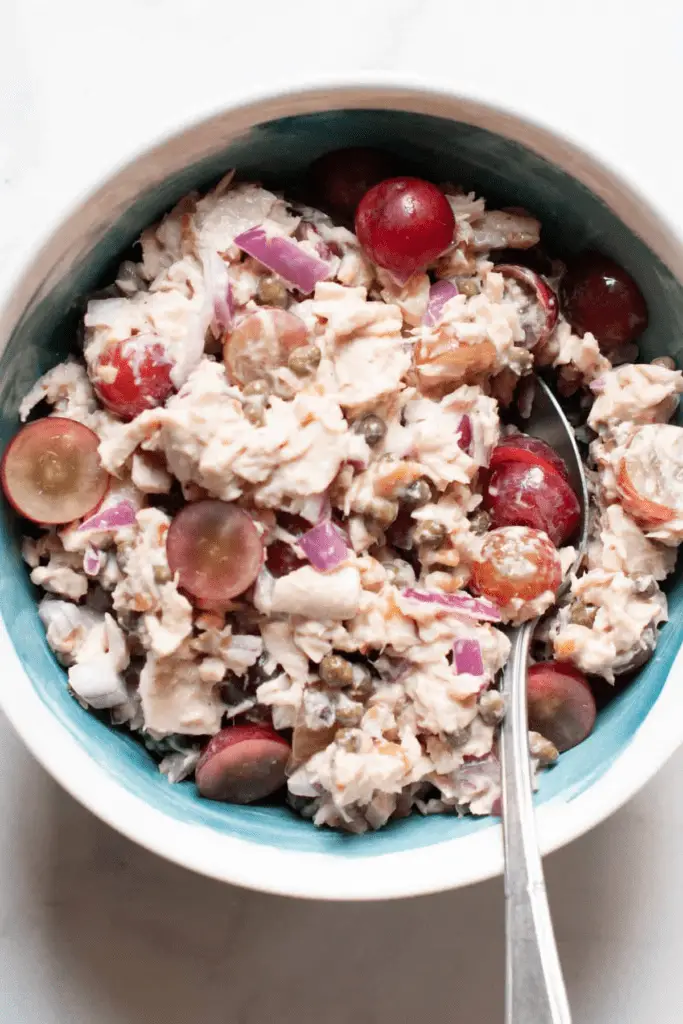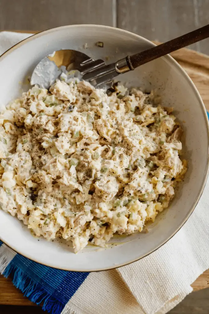 Canned tuna, drained and flaked, adds a boost of protein, while a creamy dressing made with mayonnaise, yogurt, or a combination of both, binds the ingredients together.