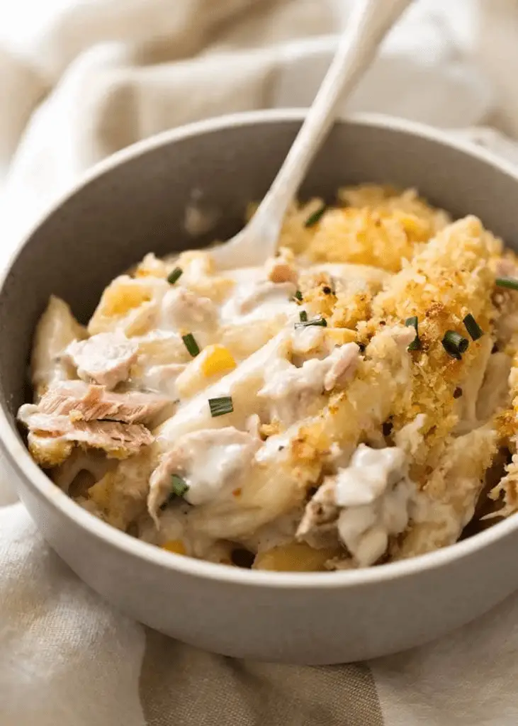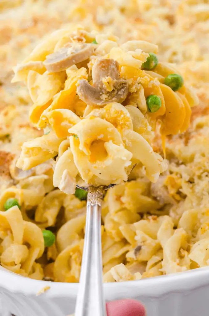 Tuna Noodle Casserole is is made by combining tuna, tender egg noodles, and a creamy sauce, often enhanced with peas and topped with a crunchy layer of breadcrumbs or potato chips.