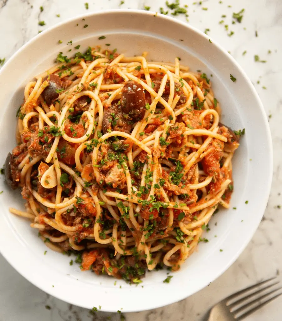 In this variation, tuna is formed into flavorful meatballs, which are then simmered in the puttanesca sauce, allowing the flavors to meld beautifully.