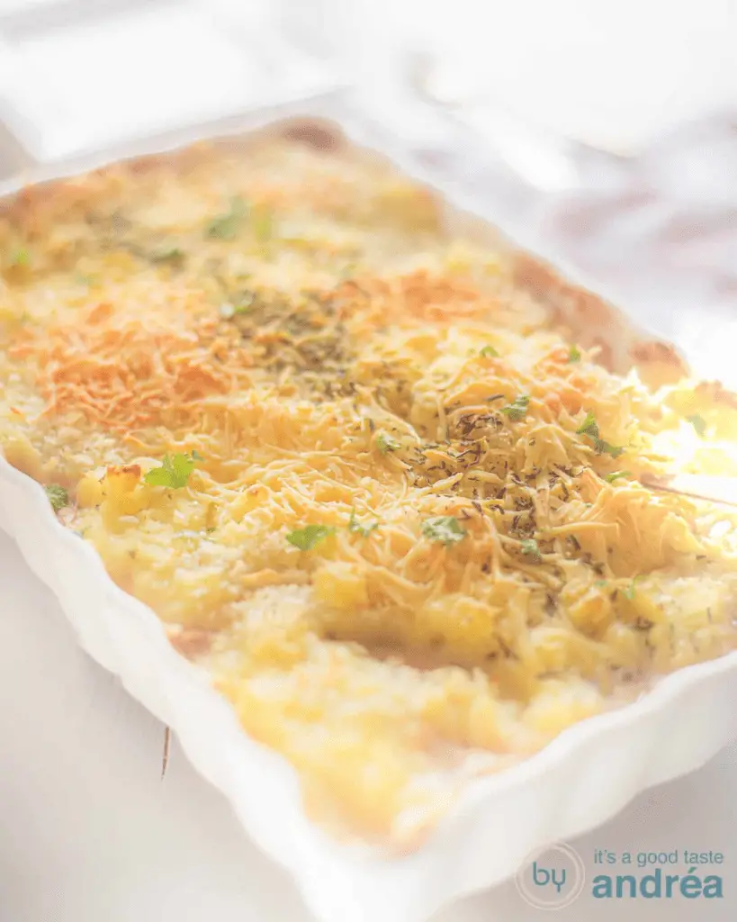 Topped with a crunchy layer of breadcrumbs or cheese, the dish is baked until golden and bubbly.
