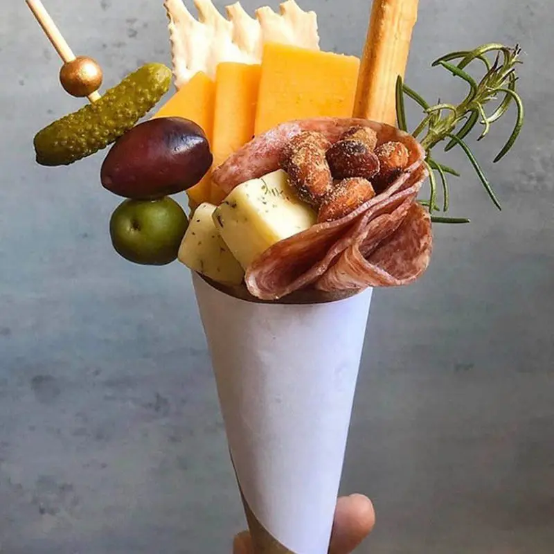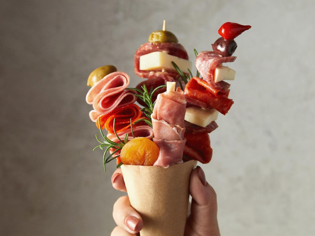 Featuring prosciutto, provolone, sopressata, and olives set in a cone.