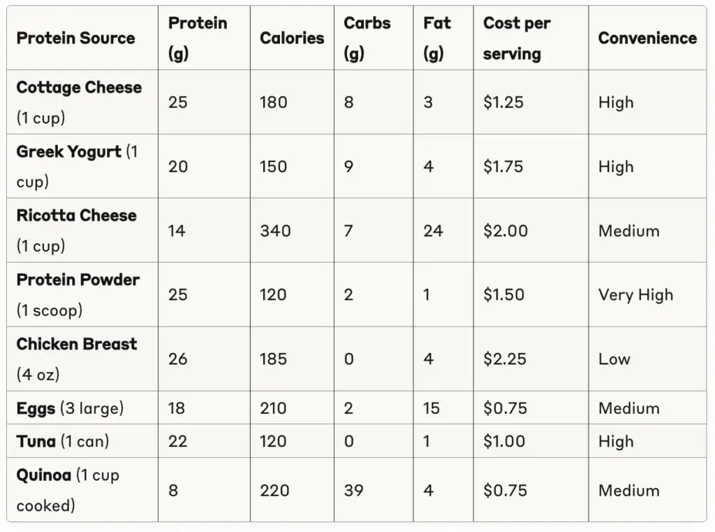 Budget-friendly protein: At about $0.10 per gram of protein, cottage cheese is one of the most economical protein sources available. Compare that to protein bars at $0.25+ per gram.