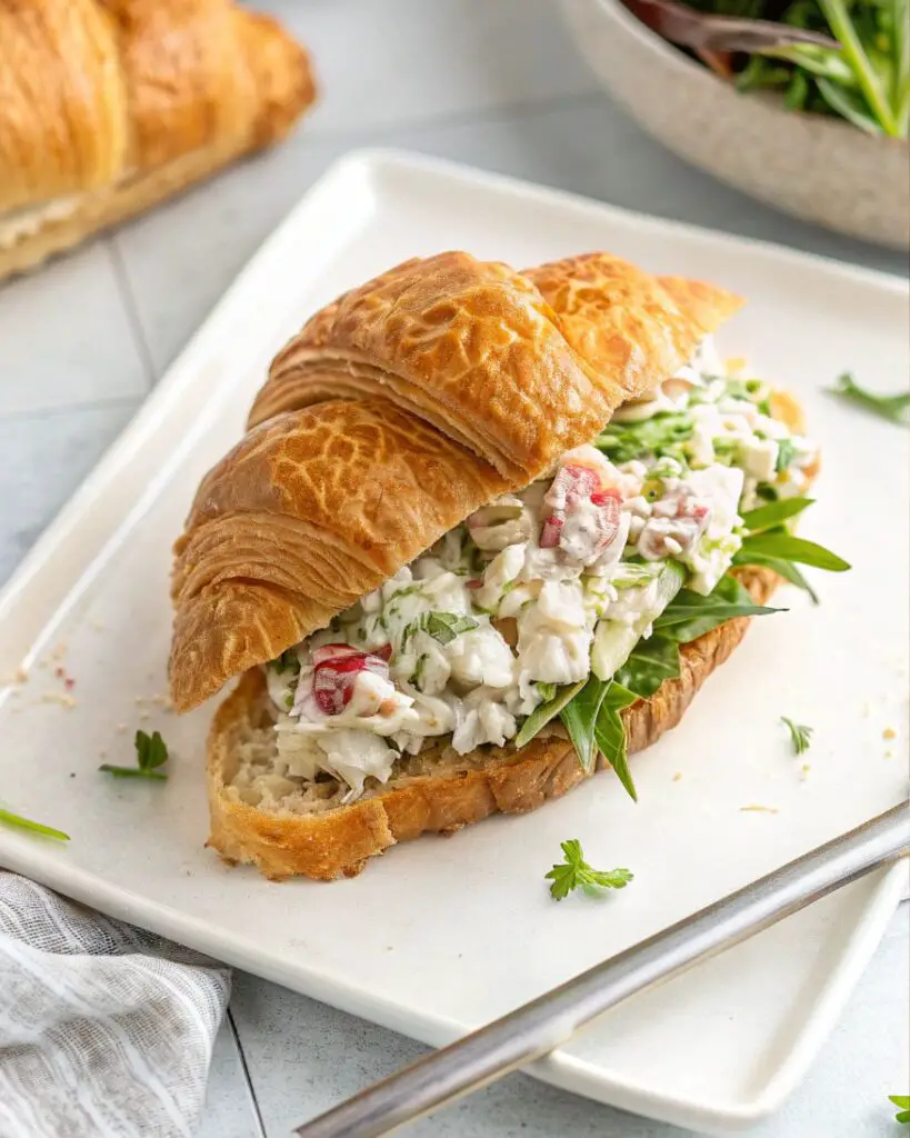Flaky croissant stuffed with creamy crab salad and fresh greens—perfect for a cozy lunch.