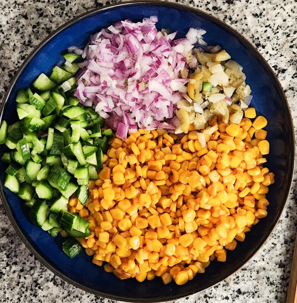 - In a large bowl, combine cucumber, red onion, pickles, chicken, and cilantro. Add cooled corn.