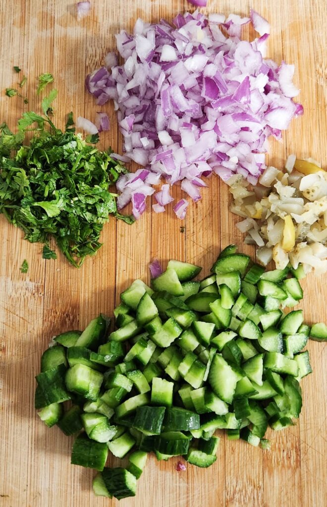Step 3: Chop cucumber, red onion, pickles, and cilantro