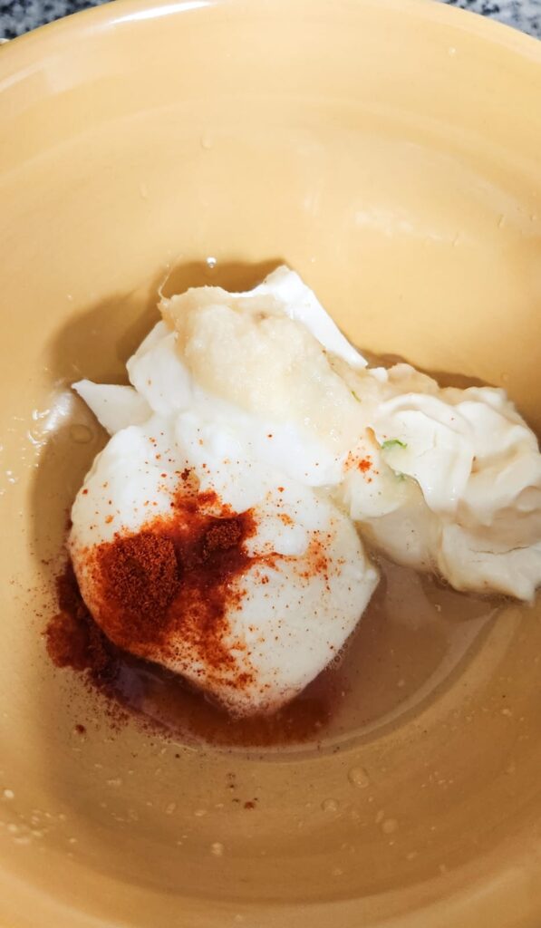 - In a small bowl, whisk together Greek yogurt, mayonnaise, lime juice, garlic, chili powder, and salt until smooth. Taste and adjust seasoning.