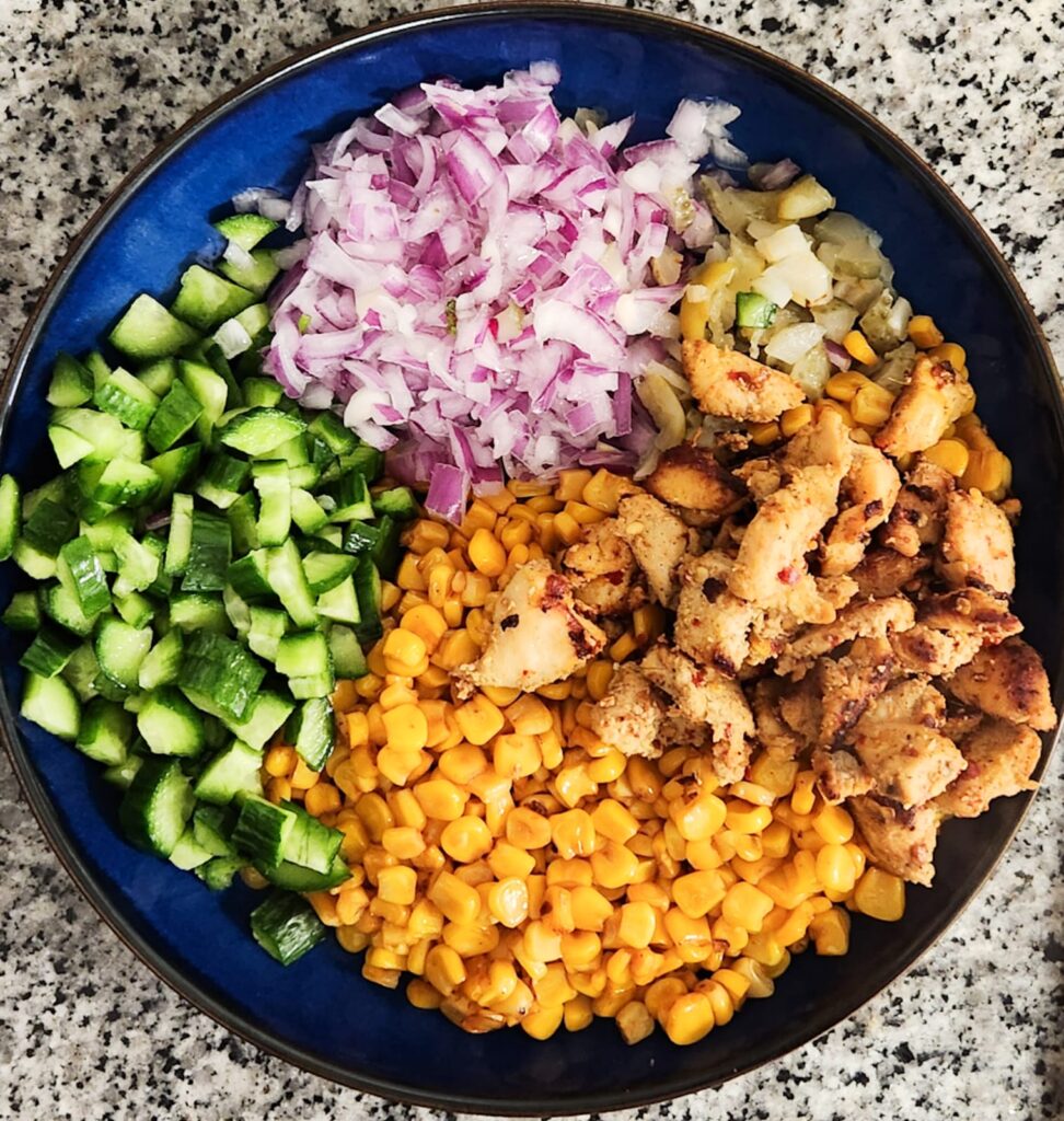 In a large bowl, combine the chopped cucumber, red onion, pickles, cooked chicken, and cilantro. Add the cooled roasted corn.