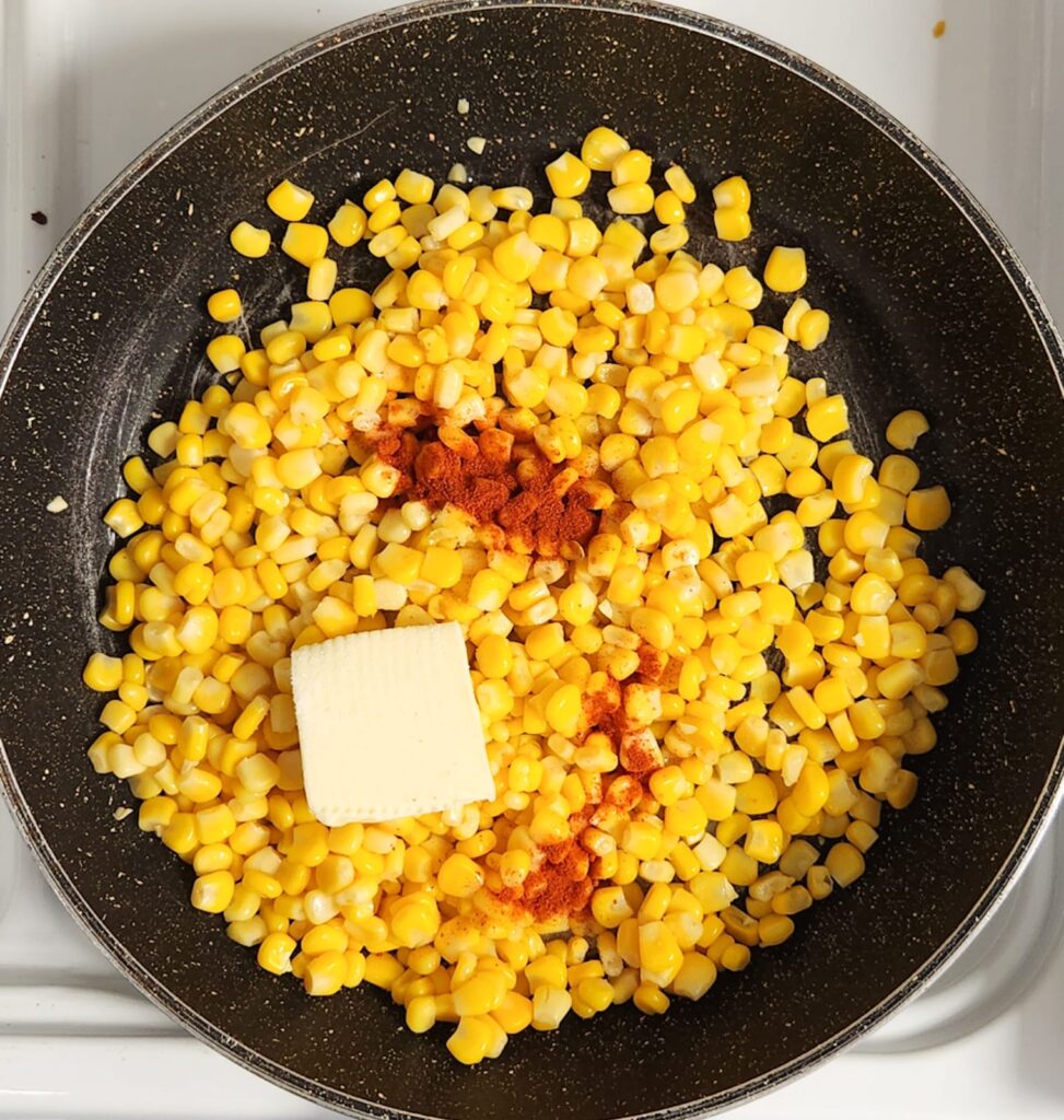 Sprinkle with salt and chili powder. Don’t stir immediately. Let the corn sit and make contact with the hot pan for a minute or two before you move it — that contact time is what creates the golden, slightly charred edges that make this step worth doing.