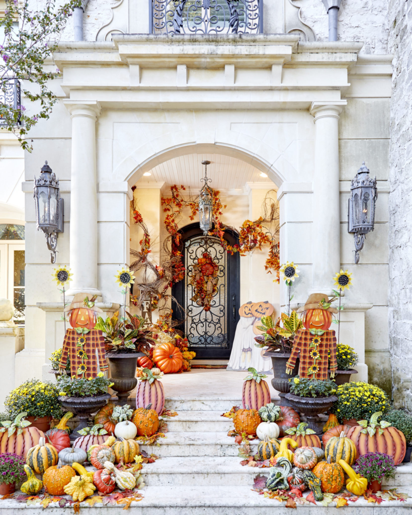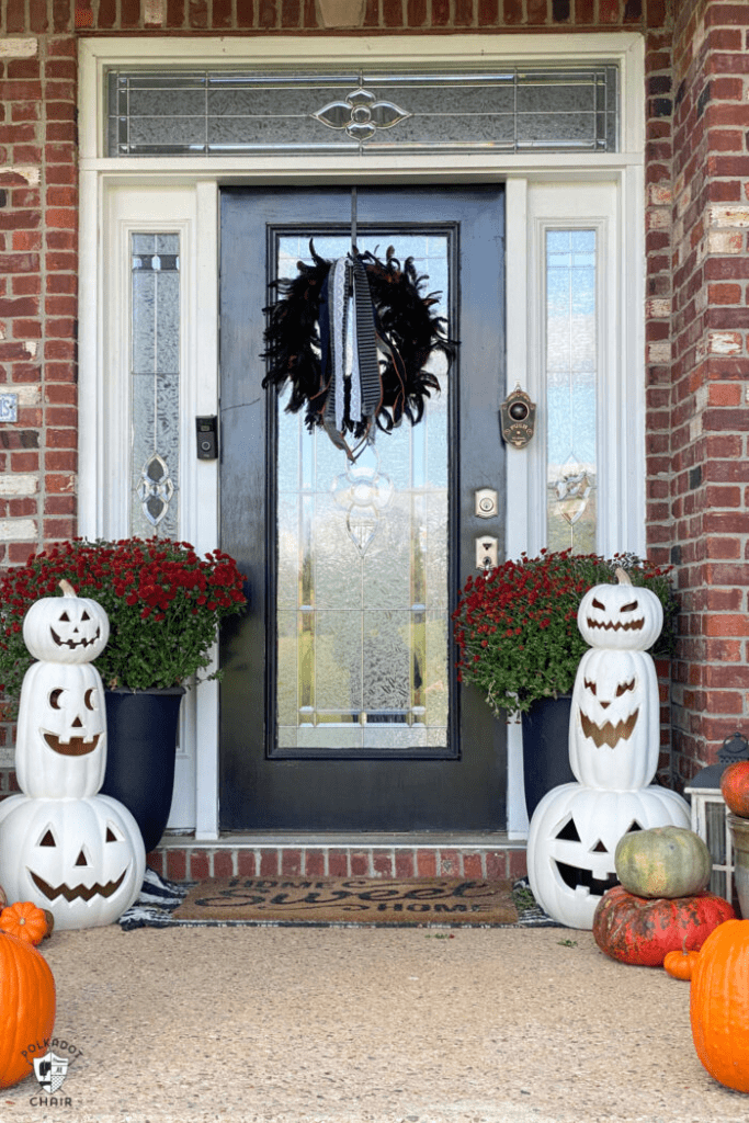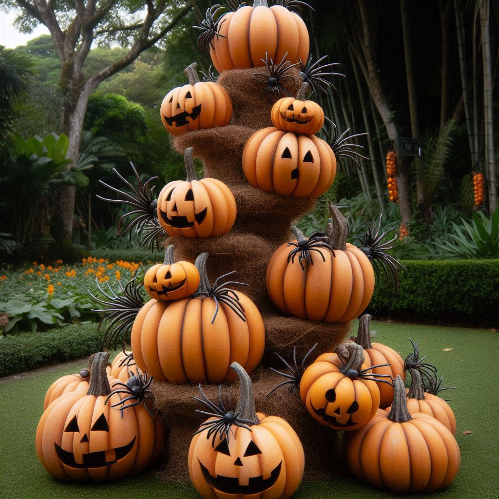 Stack pumpkins of varying sizes to create a whimsical topiary. Decorate with fake spiders or other creepy crawlies for added effect.