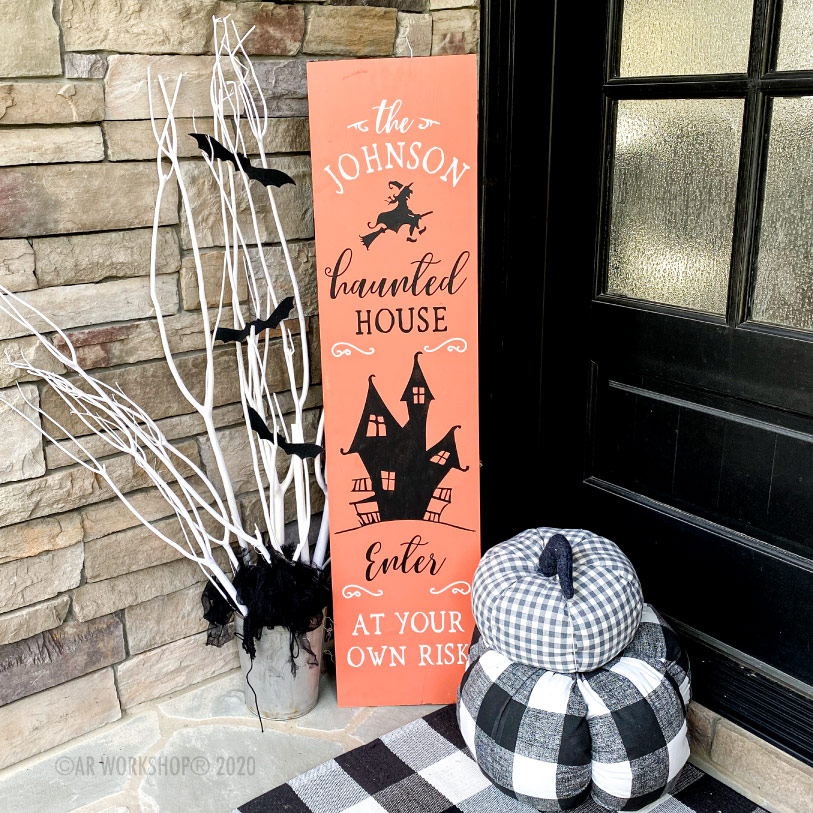 Make a wooden sign featuring a haunted house scene. Paint it with black and orange stripes for a classic Halloween look.