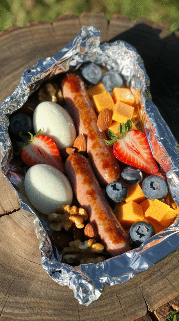 - Layer cooked sausage links, hard-boiled eggs, cheese cubes, fruits, and nuts in foil packets.
