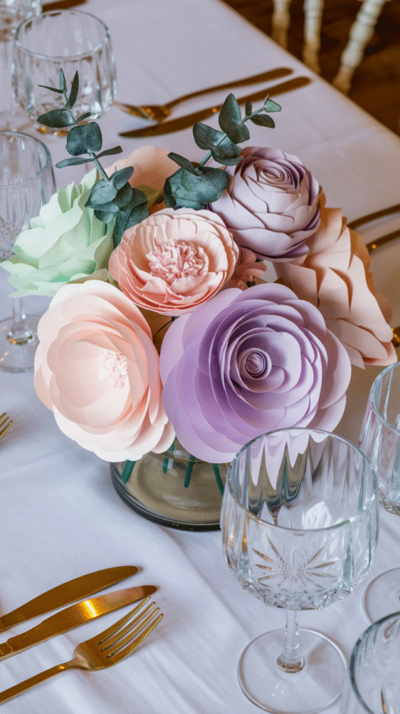 Use oversized pastel paper flowers as a whimsical centerpiece. Mix with gold cutlery and crystal glassware for a playful yet polished design.