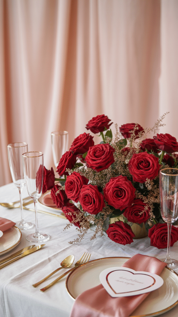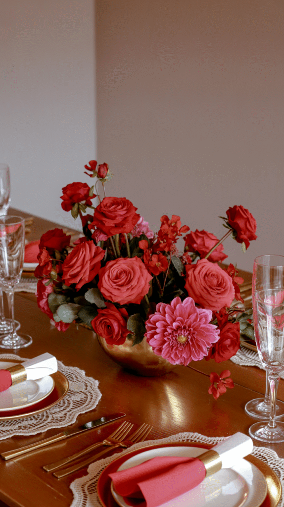 Combine deep red roses and soft pink dahlias on a table set with vintage lace placemats. Add gold napkin rings and soft lighting to create a romantic, celebratory atmosphere that feels intimate and charming.