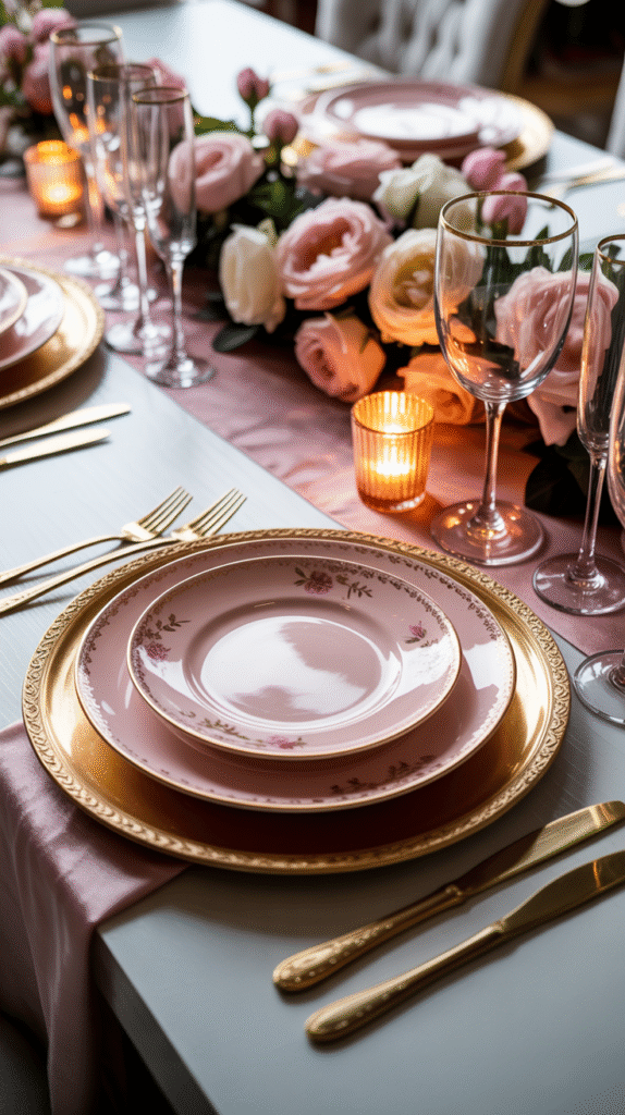 What to buy: Gold-rimmed glassware, gilded chargers, pink plates, pastel table linens, floral centerpiece, candles.