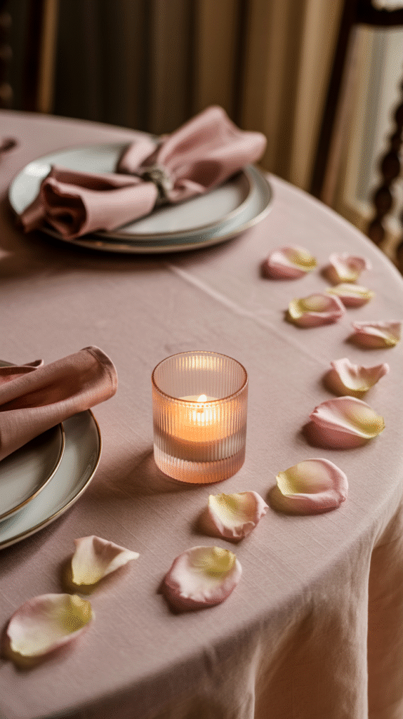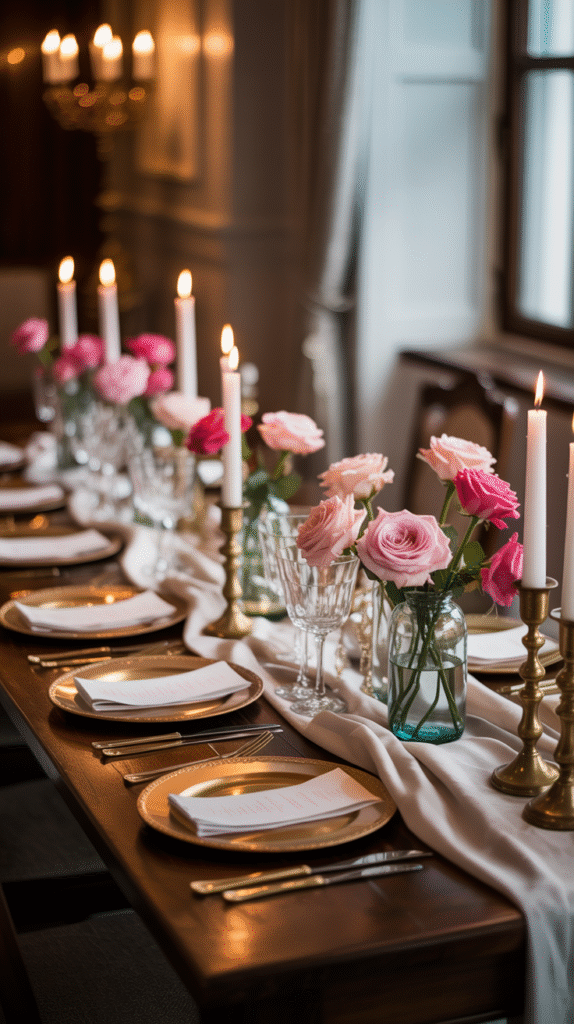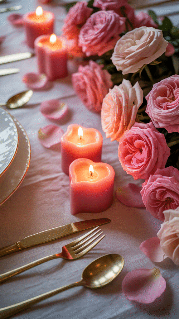 Use heart-shaped candles in pink to set a playful yet sophisticated mood. Add rose arrangements, scattered petals, and gold cutlery for a cozy, warm, and festive setup.