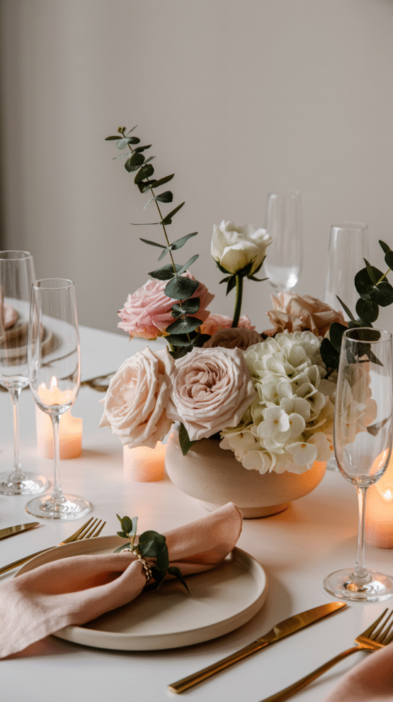 What to buy: Blush napkins, eucalyptus sprigs, neutral flowers, candles.