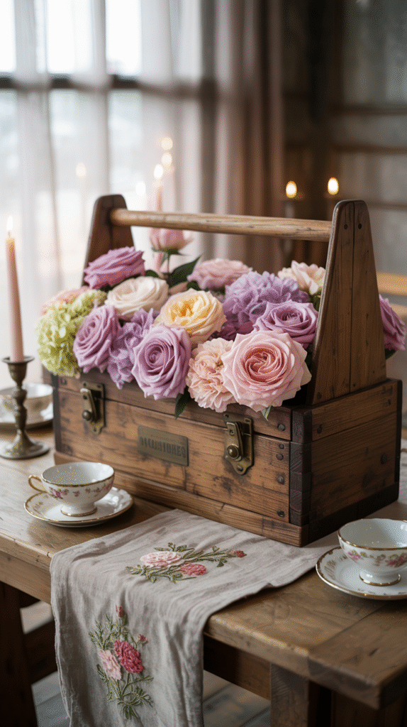 Place a vintage wooden toolbox filled with pastel flowers at the center of your table for a charming, rustic touch. Soft lighting enhances the feminine feel and whimsy of the arrangement.