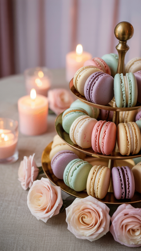 A tiered gold stand with pastel macarons doubles as décor and dessert. Surround with blush florals and candlelight to make the dessert table festive and fun.