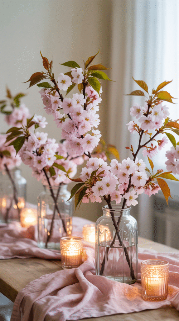 Cherry blossom branches in glass jars paired with blush table linens create a dreamy centerpiece. Soft candlelight adds a romantic, springtime vibe.