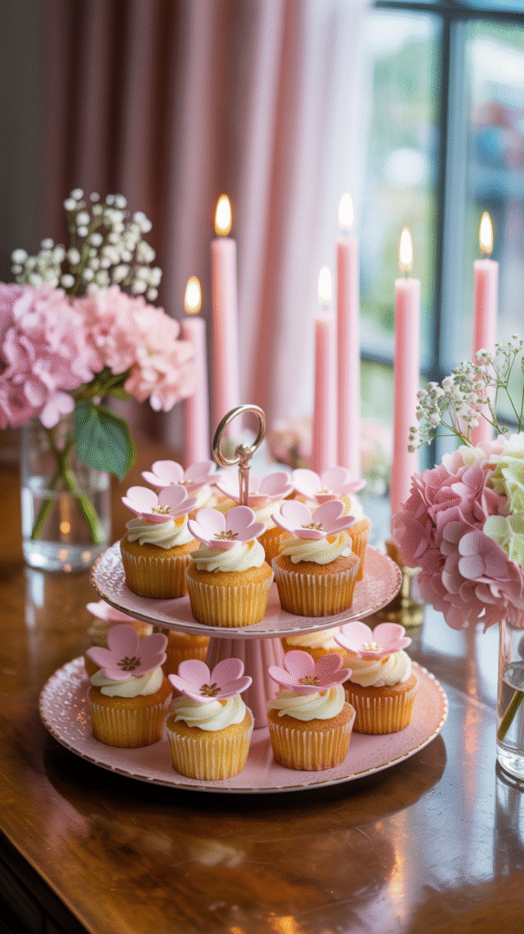 Decorate cupcakes with tiny sugar-crafted flowers and surround them with pastel florals and candles. These edible centerpieces add charm and sweetness to your table.