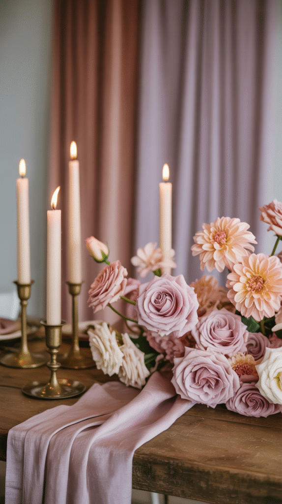 Use a flowing mauve runner with roses and dahlias to create a dreamy, moody pastel look. Soft candlelight completes the romantic ambiance.