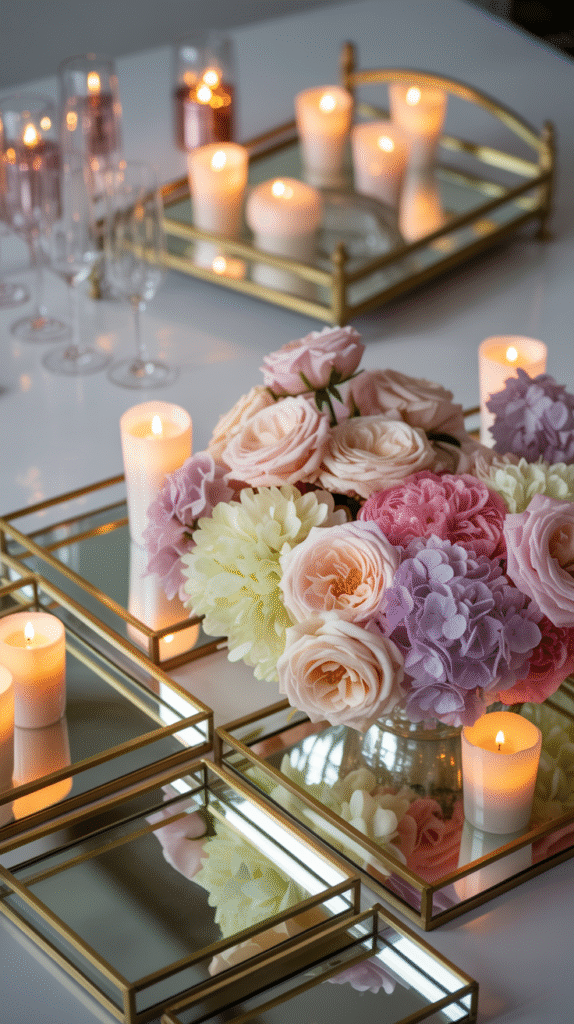 Reflect candlelight using mirrored trays and combine with lush floral arrangements to add depth and sparkle to your tablescape.