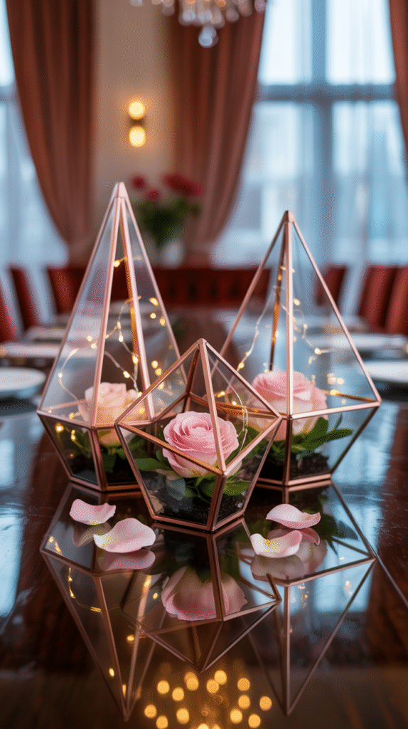 Rose gold geometric terrariums with fairy lights and soft pink roses bring a magical, modern touch to your Galentine’s table.