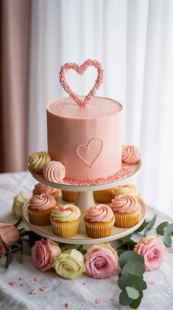 Decorate a pastel pink cake with a heart topper and surround with cupcakes and flowers for a festive dessert centerpiece.