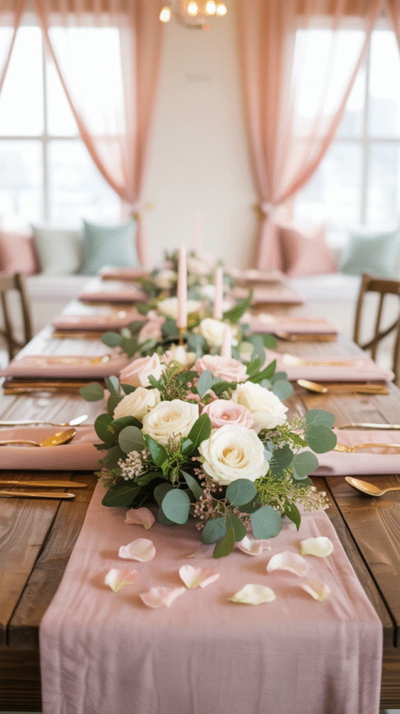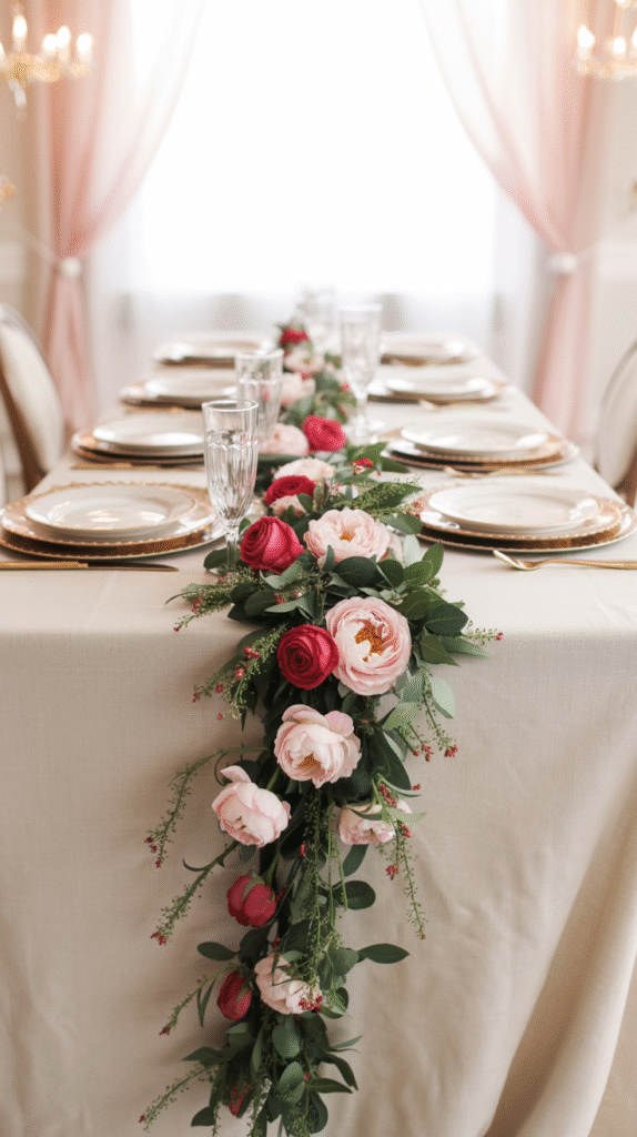 A faux rose garland running down the table creates a lush, garden-inspired centerpiece. Mix blush and red tones for a perfectly balanced romantic look.