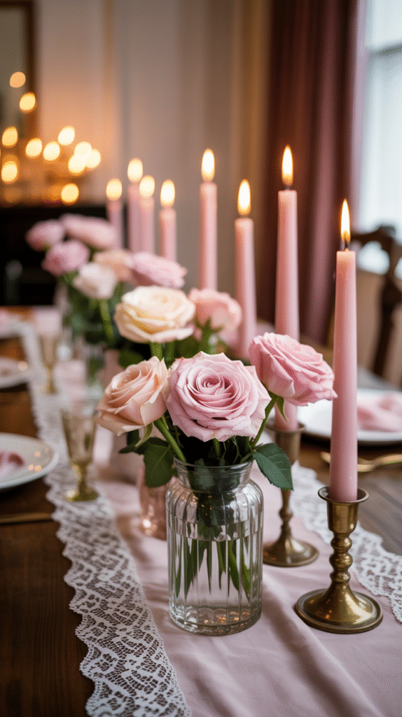 Use a lace runner, pink taper candles, and vintage rose vases for a cozy, feminine table that’s perfect for an intimate at-home gathering.