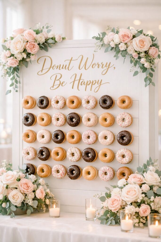 A donut station instantly adds fun and charm. Display assorted glazed, filled, and frosted donuts on a wall or tiered stand for a sweet treat everyone loves.